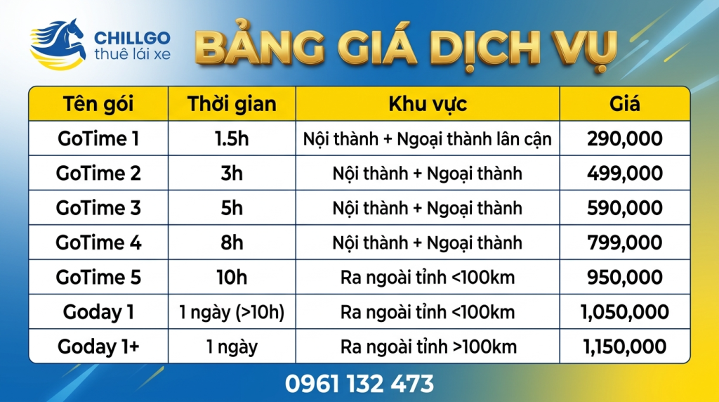 1. Bảng Giá Dịch Vụ Lái Xe Hộ ChillGo Hiện Nay